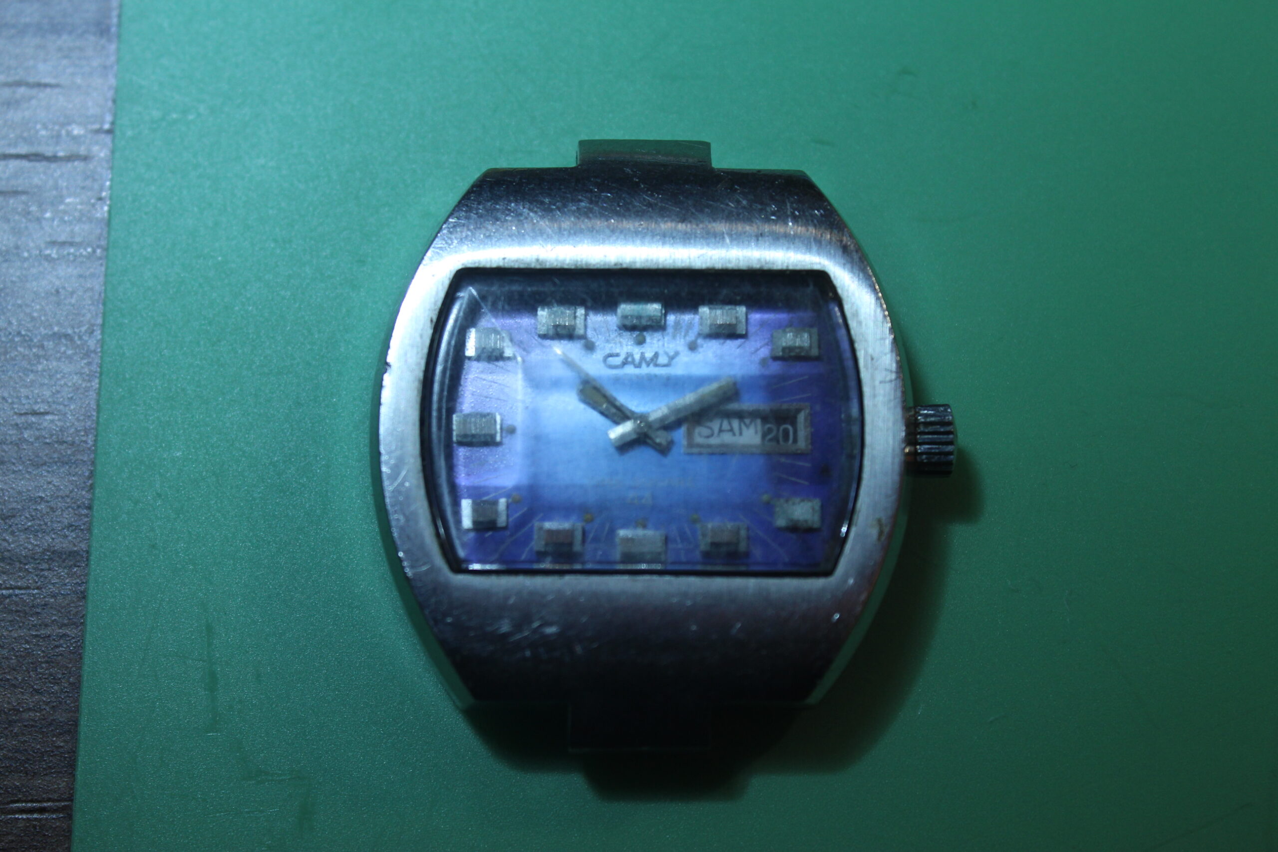 La restauration de cette vintage day/date promet d’être un sacré défi ! Que ce soit par une intervention minimale sur le cadran pour retirer cette oxydation verdâtre qui gêne l’éclat des index, ou le polissage du verre facetté, il est certain que cette pièce saura surprendre et donner du fil à retordre. Une forme très